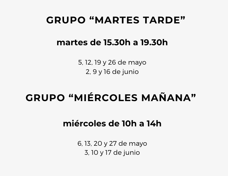 Duración: 1 clase semanal de 4h durante 8 semanas. (turno de mañana o tarde)