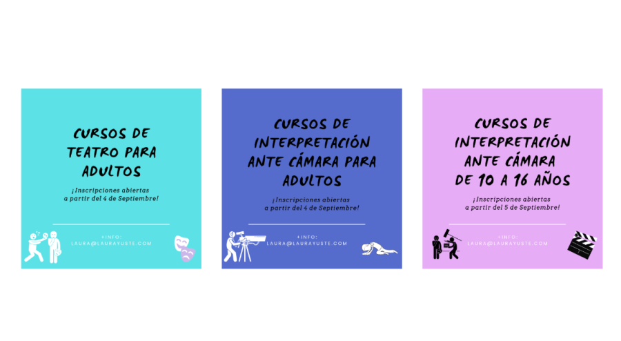 Para recibir información completa rellenar el siguiente formulario o escribir a laura@laurayuste.com Cursos de teatro o interpretación ante cámara para adultos Cursos de interpretación ante cámara de 10 a 16 años Aquí tenéis algunos de los espectáculos de las clases del curso pasado: